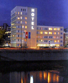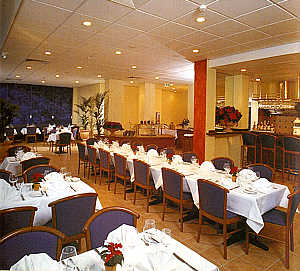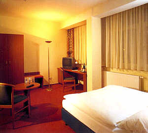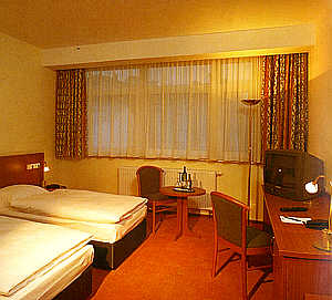 | Rezeption mit Blick in das Restaurant / den Frühstücksraum. | Alle Zimmer mit Bad oder Dusche, WC, Klimaanlage, Telefon, Minibar, Pay-TV, SAT-TV und Internet- Zugangsmöglichkeit. |
