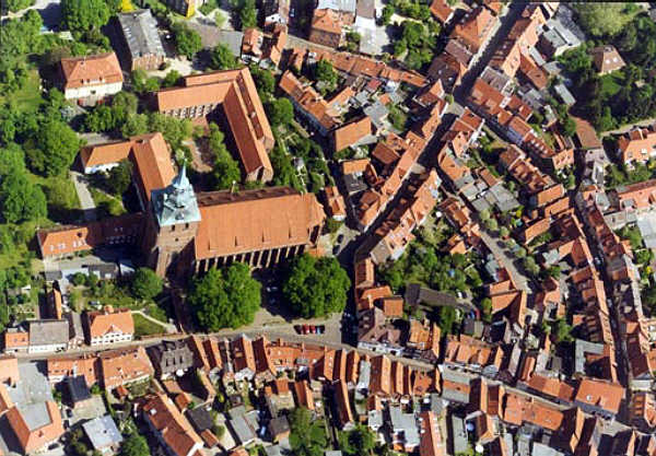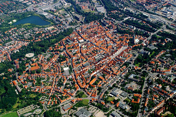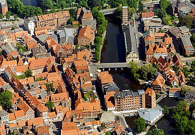 anders aus. Auf dem Panaroma des Lüneburger Stadtkern sind deutlich sind die Grenzen der Altstadt zu erkennen, die früher eine Mauer umgab. Reste sind noch heute am Liebesgrund zu bewundern. |