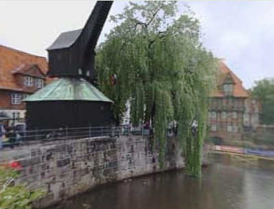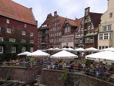 Der Stintmarkt Lüneburgs altes Hafenviertel mit dem Alten Kran und seinen pittoresken Häusern ist heute eine romantische Kneipenmeile |