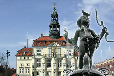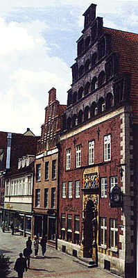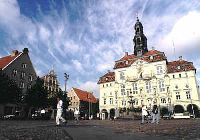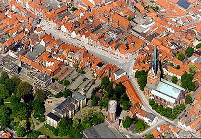 | Am Platz Am Sande stehen viele der schönsten Giebelhäuser der Stadt und die Hauptkirche St. Johannis, berühmt für ihren schiefen Turm. | ||